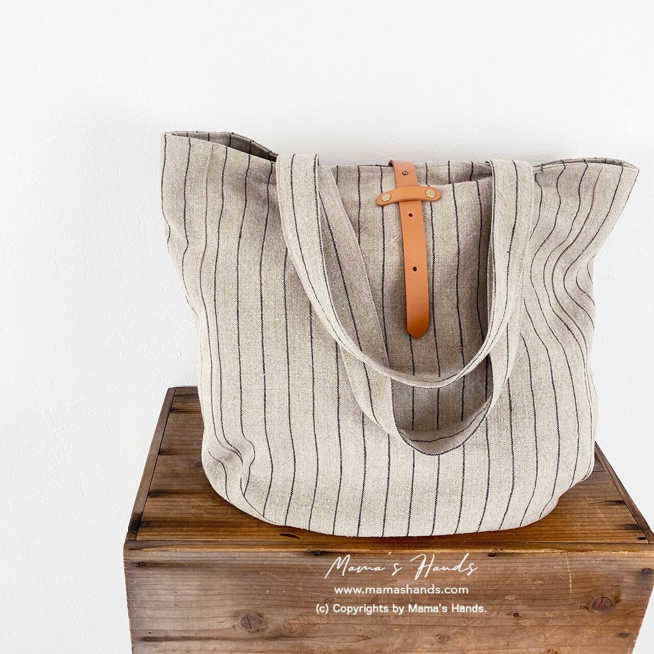 ⭐️厚めのリネン生地を使用。2枚仕立ての軽い大きめバックです。革とギボシが付いているので、バックに入れる物の大きさによって、3段階で留められます。