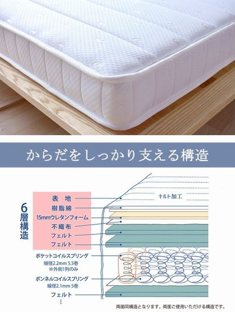 ■マットレス主材/2.1mmボンネルコイルスプリング(コイル数:270)、2.2mmポケットコイルスプリング(コイル数:92)、ウレタン、フェルト、ポリエステル、両面多針キルティング加工