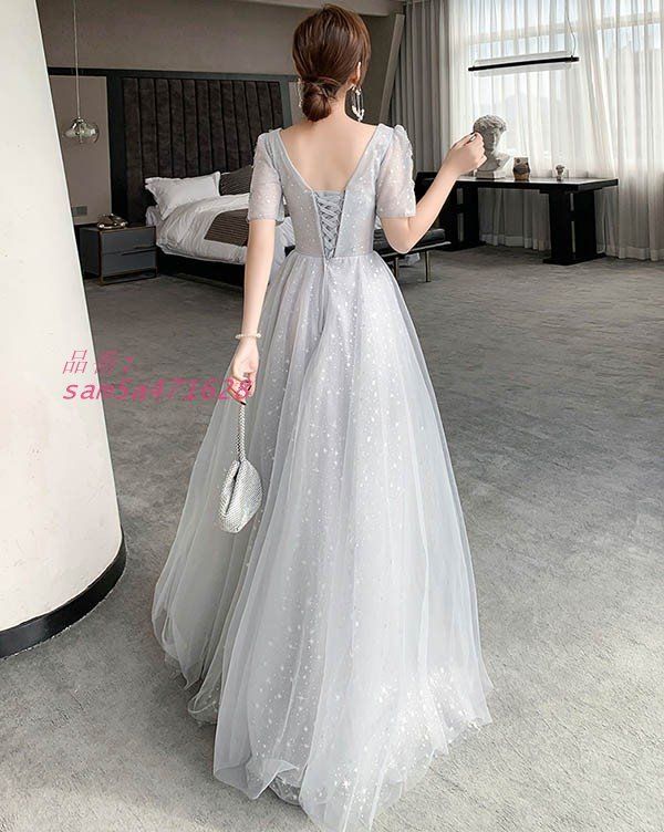 ブライズメイド ドレス 大人 ピアノ 発表会 ロングドレス ワンピース 袖付き ピアノ発表会 ミモレ丈 グレー 結婚式 演奏会 母親 半袖 am 5 a 471628