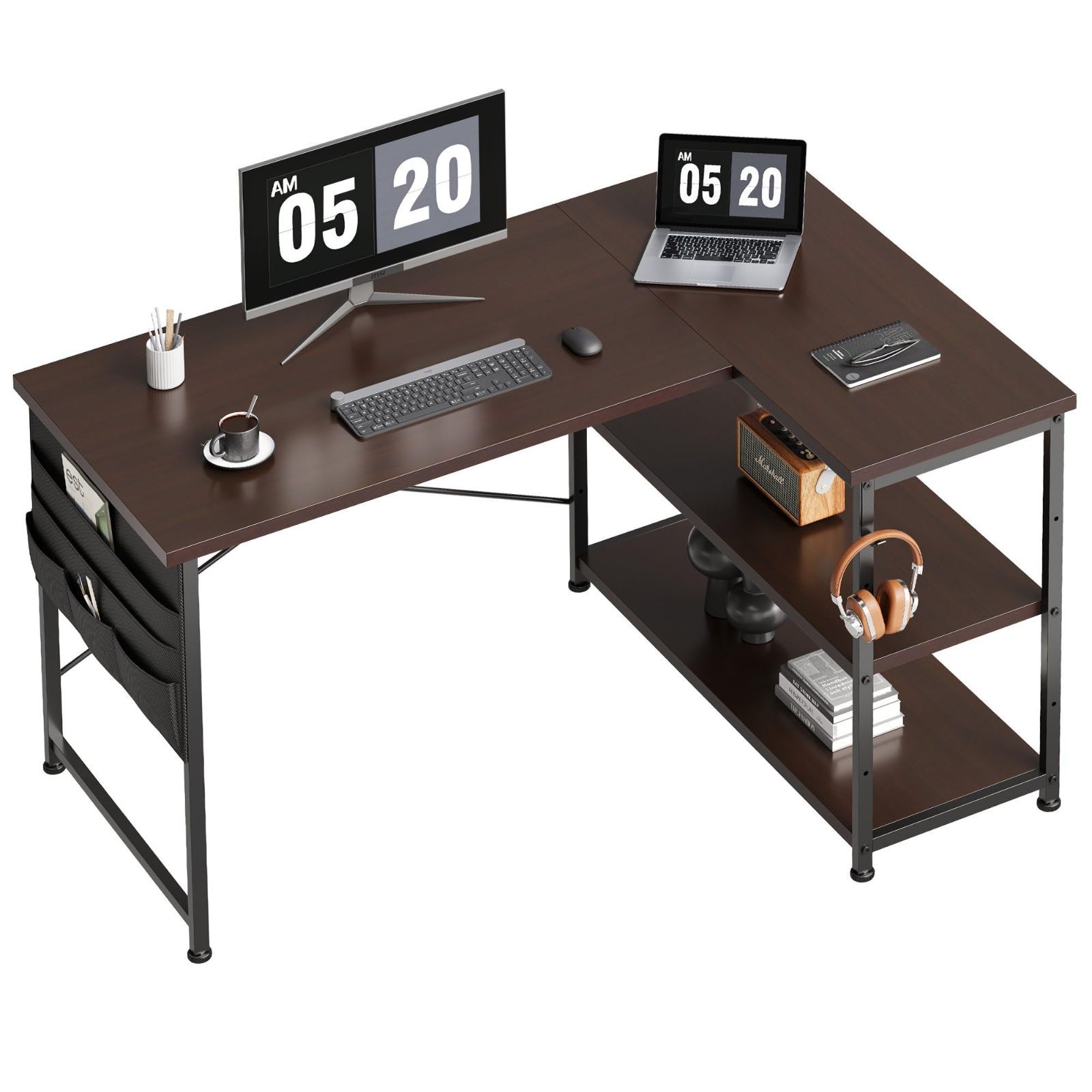 勉強机 作業 PC L字型 在宅勤務 収納袋付き リモートワーク 棚板高さ調節 コーナーデスク ゲーム pcデスク 幅120 cm 書斎 デスク 収納ラック付き ゲーミングデスク l字デスク ダークブラウン YeTom