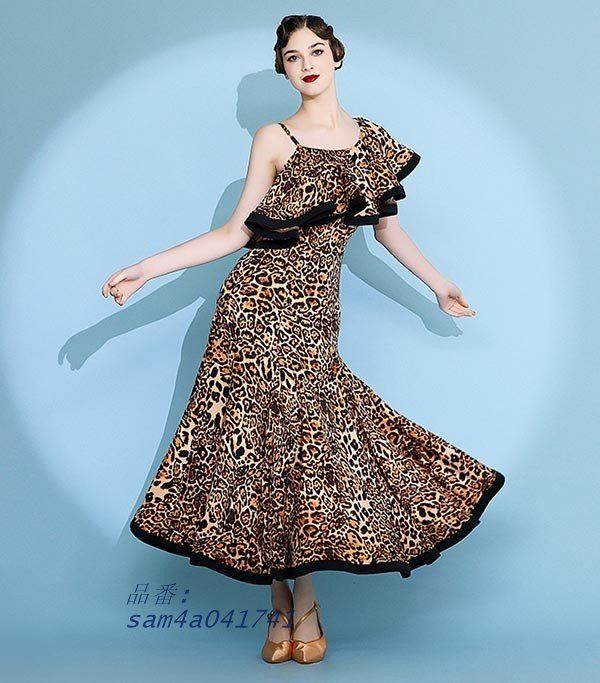 社交ダンスドレス 広がる裾 競技用ドレス ダンス衣装 ダンスウェア ステージ衣装 大きいサイズ カラオケ スタンダード ドレス ワルツ ワンピースドレス 舞台 演奏会 発表会ドレス パーティー デモ 衣装 ヒョウ柄 S M L XL 2XL ZELA