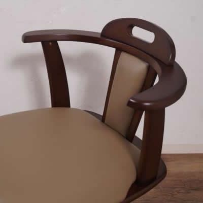 毎日の食事やリラックスタイムに便利な360度回転式。立ち座りもスムーズで、高齢の方にもおすすめです。シックなダークブラウンのフレームと、お手入れしやすい合成皮革(PVCレザー)の座面・背もたれの組み合わせで、どんなお部屋にも馴染みやすいデザインです。