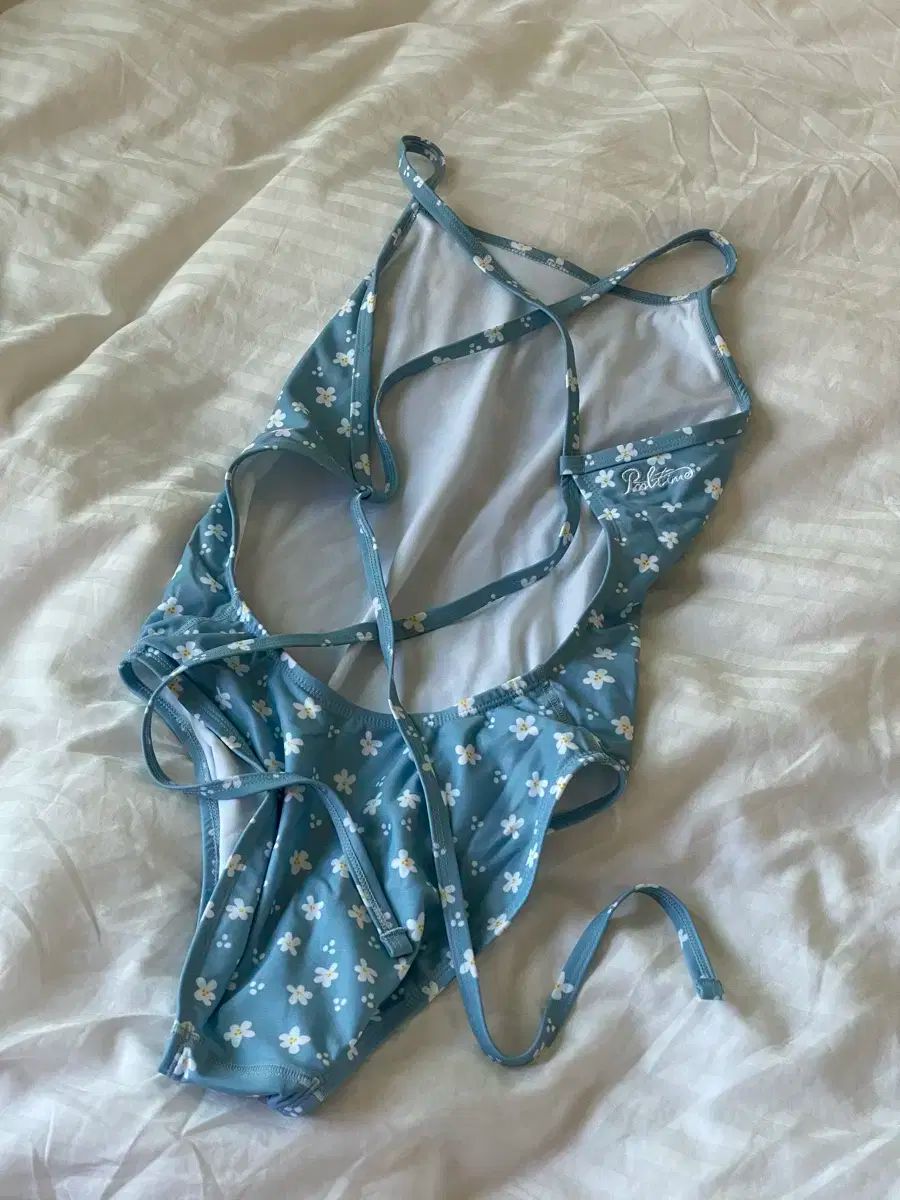 スカイブルーのバターンにキャモマイルの花が描かれたフールタイム キャモマイル タイバッグ M水着です。タイバッグ デザインでサイズ調整が容易です。