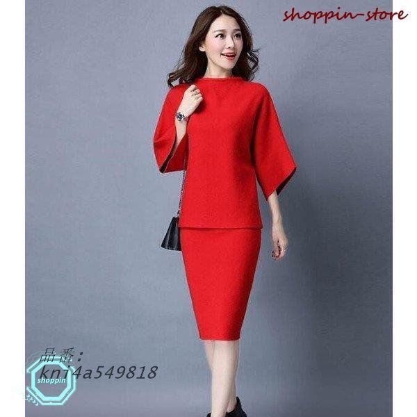 セットアップ レディース ニットウェア トップス プルオーバー 七分袖 膝丈 タイトスカート ウエストゴム バイカラー 2点セット 通勤30代 40代 秋冬