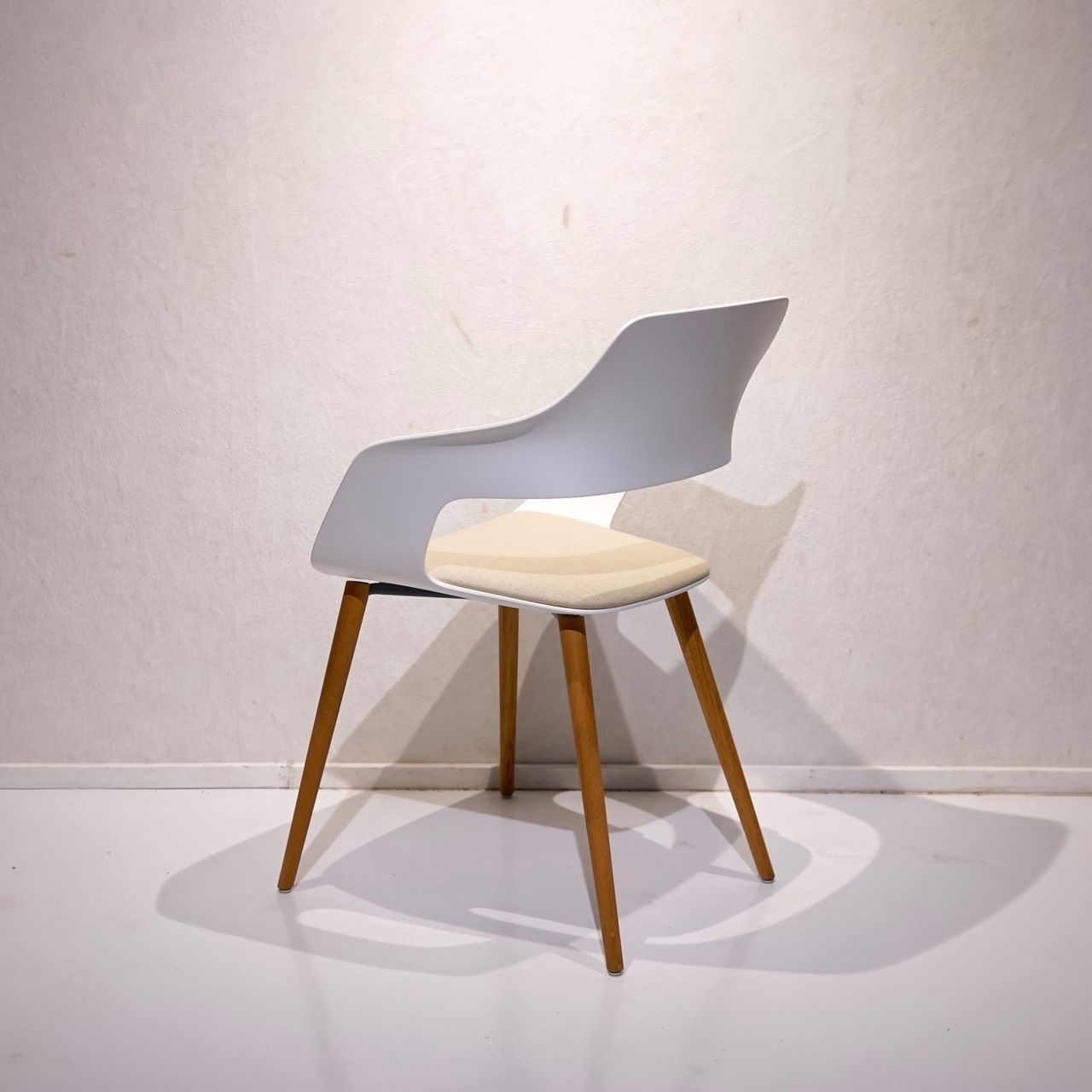 柔らかい曲線のシェルと天然木脚のコンビネーションが、北欧デザインの温かみとモダンな洗練を兼ね備えています。