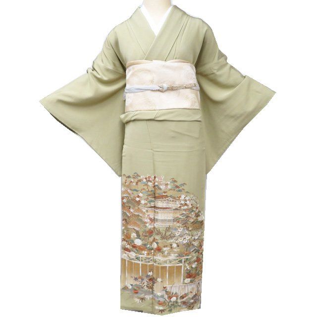 色留袖 着物 正絹 袷 紋付 一つ紋 蘇州刺繍 中国刺繍 花の図 箔糸 抹茶色 多色 身丈153.5 cm 裄64.5 SA きもの北條 A 1286-10