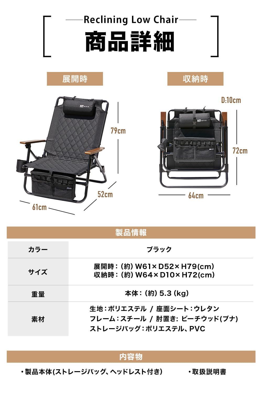 WAQ Reclining Low Chair リクライニングローチェア RLC 1 折りたたみチェア リクライニングチェア アウトドア 焚き火 アイアン ドリンクホルダー