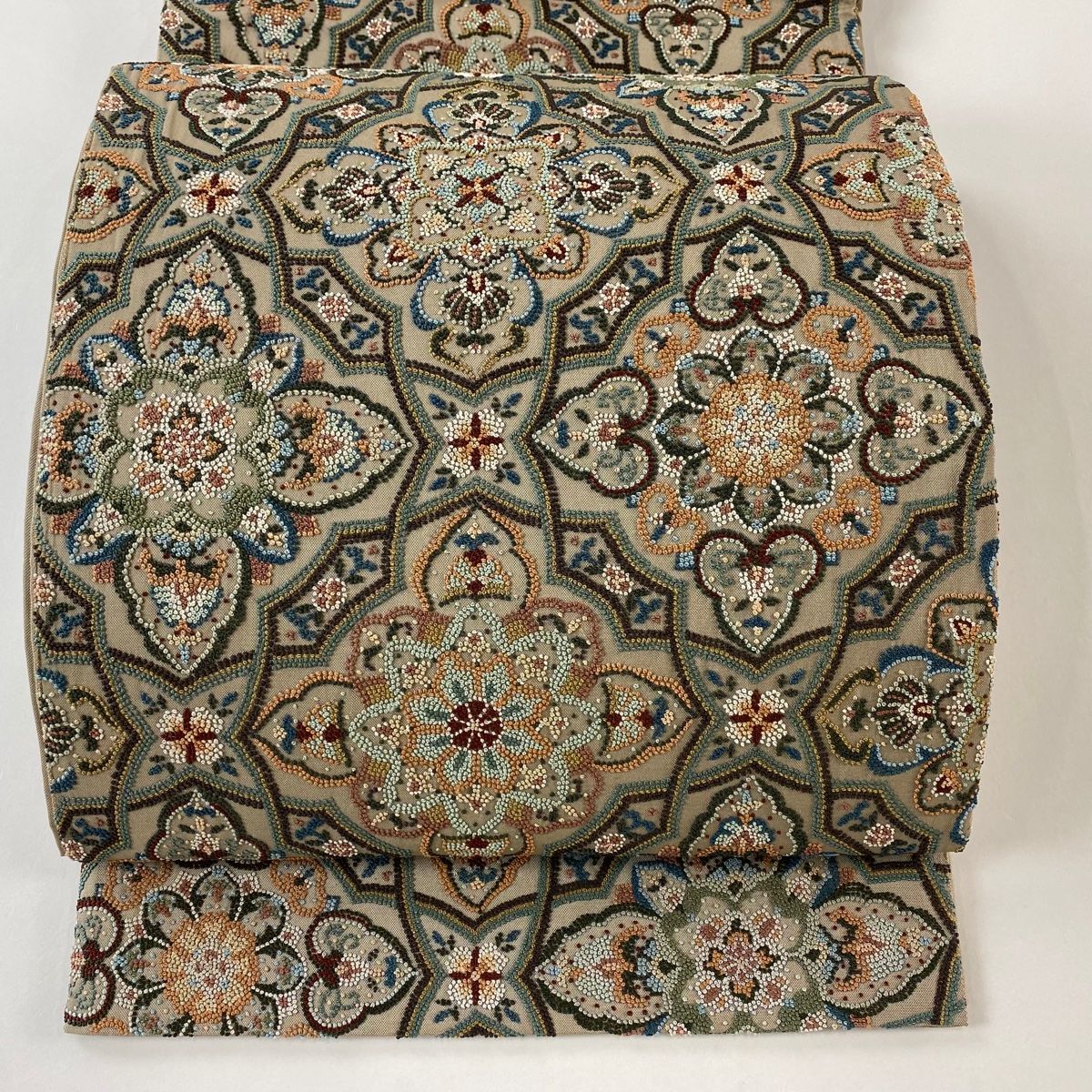 袋帯 華文 相良刺繍 薄茶色 六通 正絹