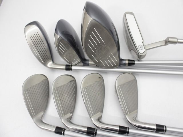 【備考】セット内容:1W、5W、6H、7.9.P.S、パター。ウッド3本とパターはヘッドカバー付きです。パターはスチールシャフトです。状態は6Hのクラウン中央に1ヵ所凹みがありますが、それほど酷くはありません。その他は擦り傷や多少のアタリ傷はありますが、大きな傷はありません。ウッド類のクラウンは凹み以外はキレイな方です。シャフトとグリップも特に問題はありません。ヘッドカバーは多少の汚れはありますが、状態は悪くありません。