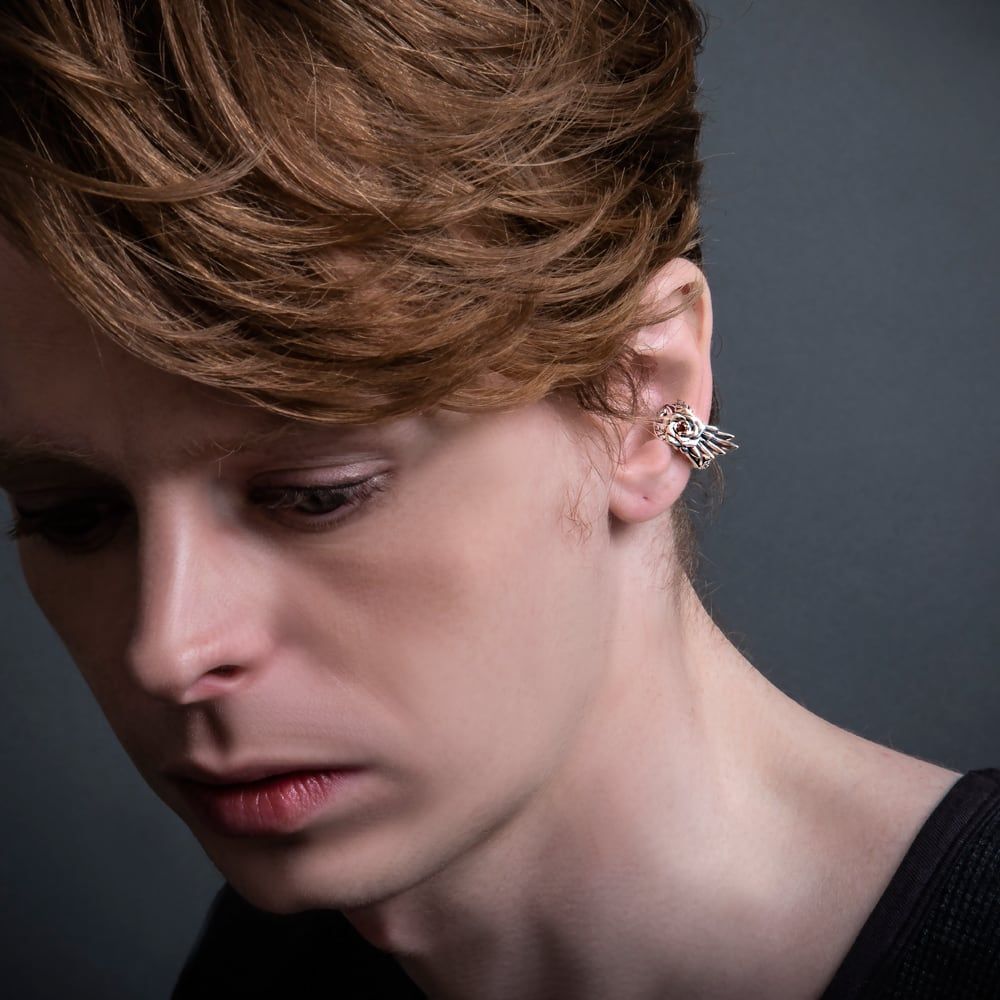 耳元に羽ばたく一輪の気品。〈ローズイヤーカフ〉は、翼・唐草・薔薇を重ねた立体彫刻に、深紅の天然ガーネットをひと粒添えたアイコニックな一作です。花びらの起伏や羽根の先端まで細密に仕上げ、鏡面の艶と燻しの陰影が奥行きを強調。横顔にドラマを生む大胆なシルエットながら、肌に沿うカーブで着け心地は軽やかです。ピアスホール不要。耳の内側に挟むだけで、片耳のアシンメトリーも品よく完成します。仕立てはアトリエにて、で一つひとつ丹念に調整。愛と美を象徴する薔薇が、日常も特別な日も、あなたの表情を凛と引き上げます。ユニセックスでお楽しみいただける、存在感あるイヤーカフです。