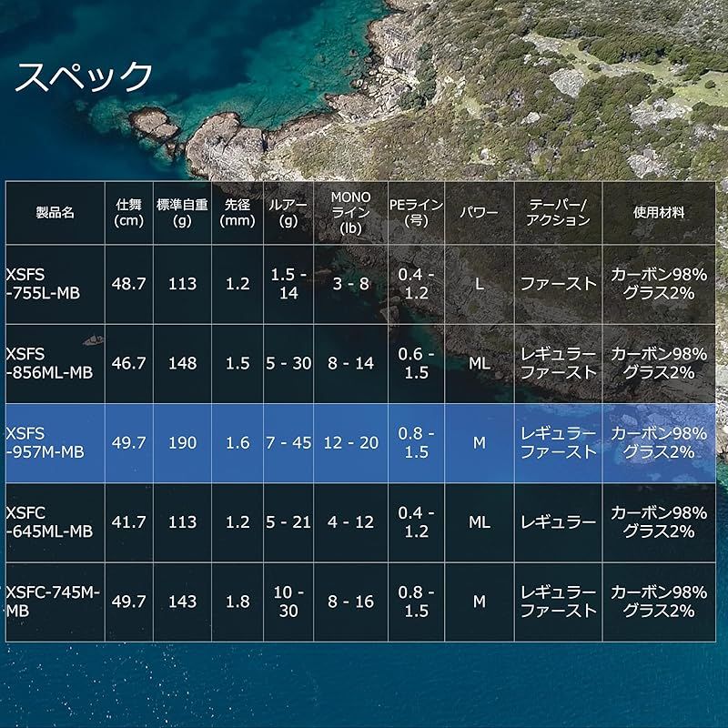仕舞 (cm)49.7●標準 自重(g)190●先径(mm)1.6●ルアー (g)7 - 45●MONOライン (lb)12 - 20●PEライン (号)0.8 - 1.5●パワーM●テーパー/アクションレギュラーファースト●製法チューブラー●使用材料カーボン98%,グラス2%