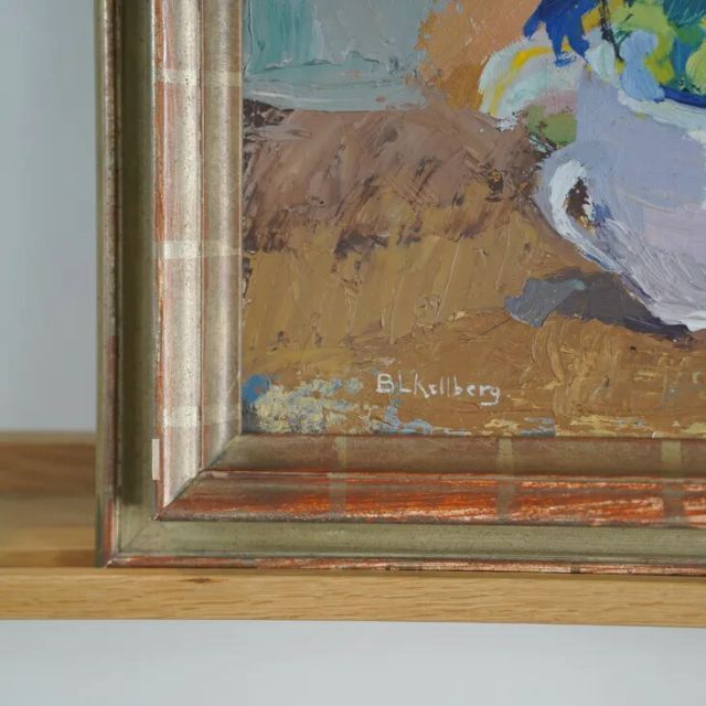 スウェーデンの画家(作者不詳)、による穏やかで独特なスウェーデン・ミッドセンチュリー抽象静物画。柔らかなパステルブルーとパテの色合いが織りなす、春らしい爽やかで可愛らしいパレットに、色とりどりの野花が咲き誇るティーカップと、その横に飾られた白樺の枝が描かれています。金箔押しの木製フレームに額装されており、すぐに飾ることができます。様々なインテリアシーンにマッチする作品です。