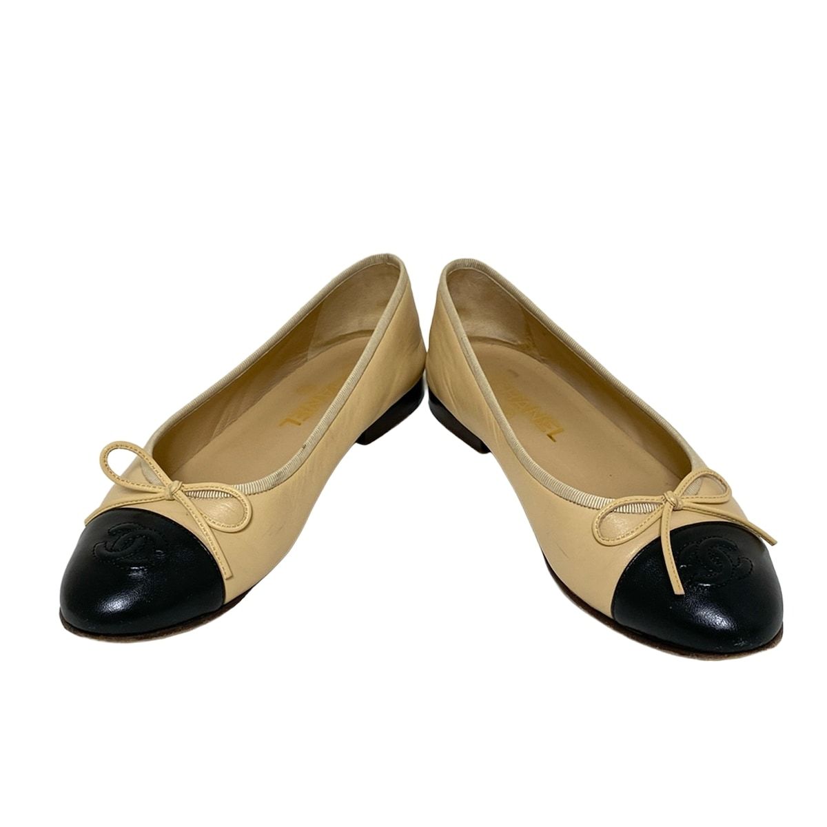 CHANEL シャネル フラットシューズ 361|2 C レディース - G 02819 ベージュ×黒 ココマーク|リボン ラムスキン