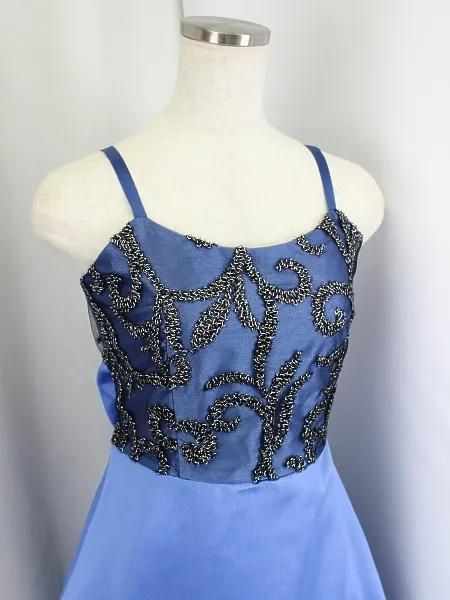 身ごろは金糸の刺繍レース、スカートとバックリボンはシャンタン、肩ひもの幅は1cm程度
