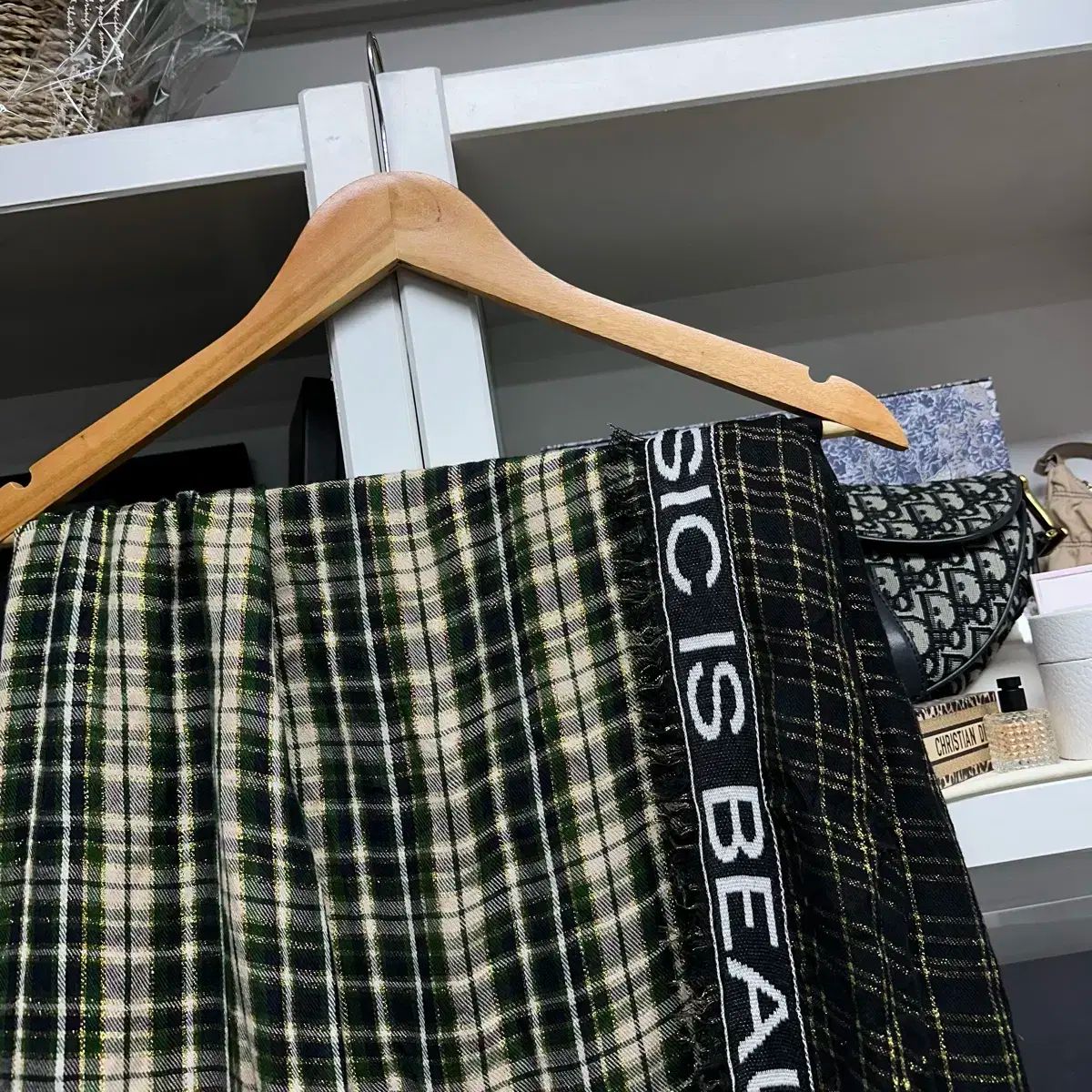深みのある色を調和させたチェック柄には、側面に官能的なレタリングがアクセントになっており、軽く包んでも高級感があります。