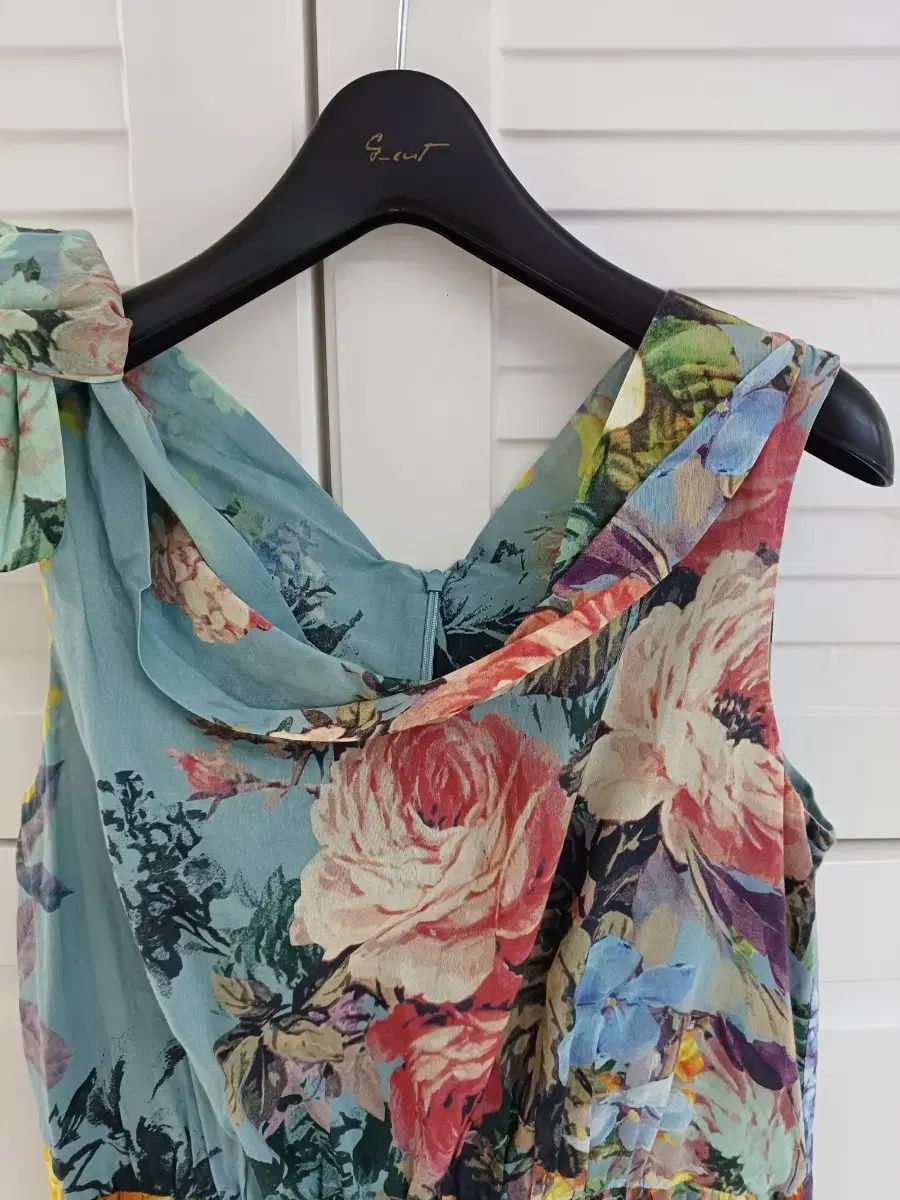 レニーボーンならではの高級な花柄、ミントを一滴混ぜたスカイブルーのビンテージカラー、ショルダーリボンのディテールなど、要素はどれも美しい。