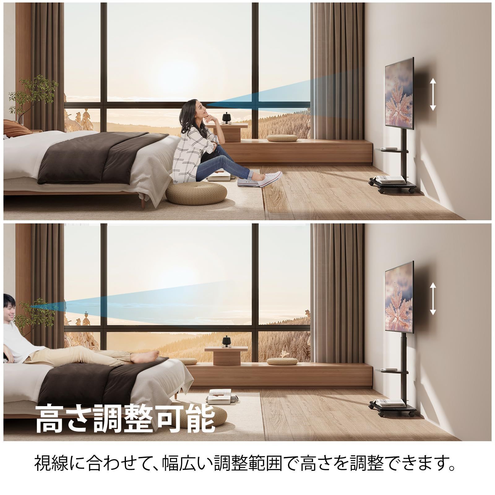 <テレビの安定した設置に最適なFITUEYESテレビスタンド。32~70インチのテレビに対応し、キャスター付きで移動も楽々。高さと角度も調節可能で、お部屋のレイアウトに合わせて自由自在。さらに中段に棚板がついているので収納力も抜群です。> -||-