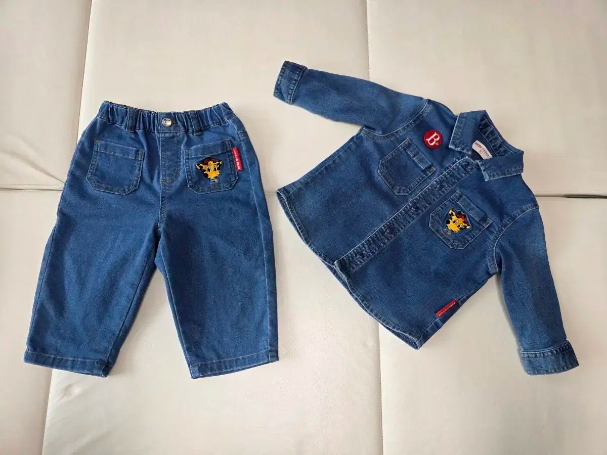 ベベデピノ デニムシャツ 上下セット 90サイズです。可愛いキャラクター 刺繍が POINT で入っています。デニム 素材で丈夫で、男の子 女の子 모두 よく似合います。