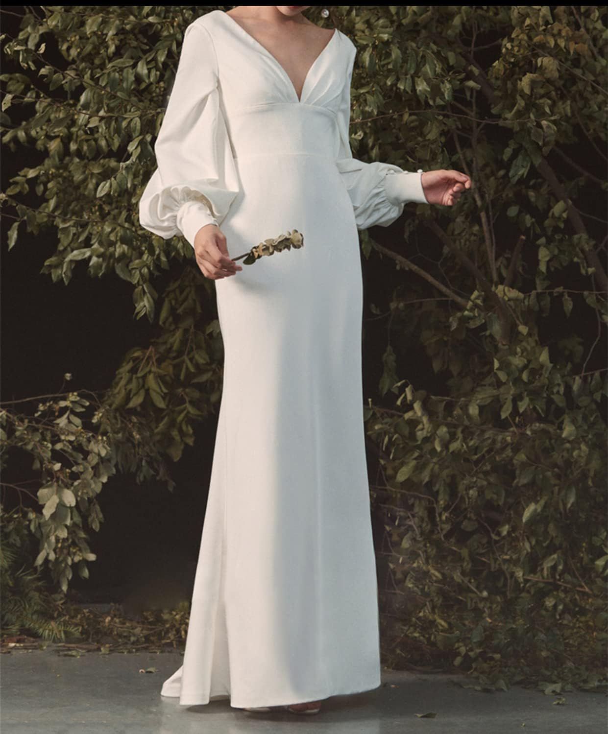 花嫁ドレス 白ワンピース ロング 結婚式二次会 発表会 マーメイド 前撮りドレス Vネック 長袖 ウエディングドレス Fiveen