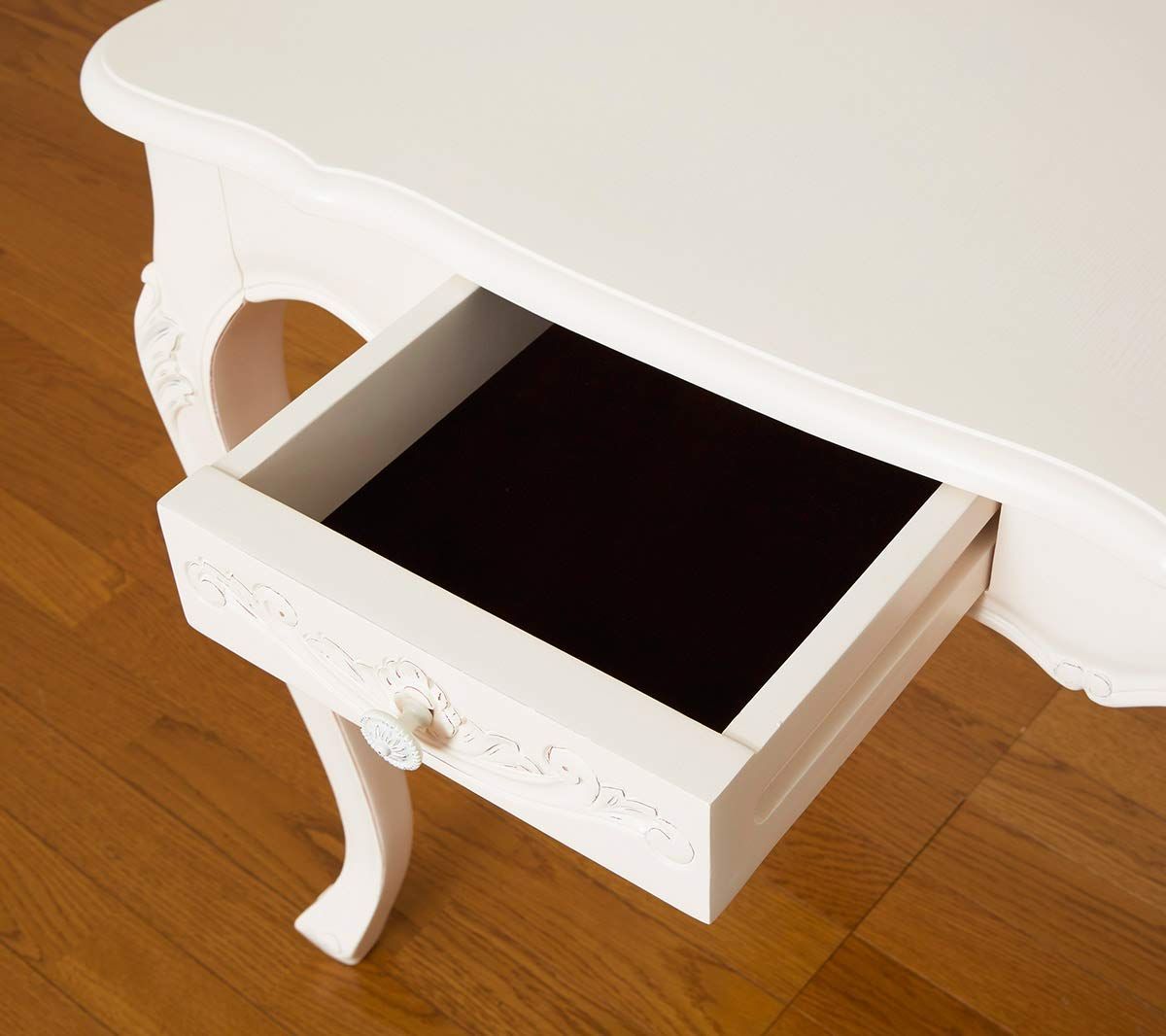職人によるアンティーク調の手彫り仕上げ、優雅なネコ脚がエレガント。華やいだ空間を演出します。 カトラリーなどの収納に便利な引出付、引出内部は丁寧なフェルト貼りです。